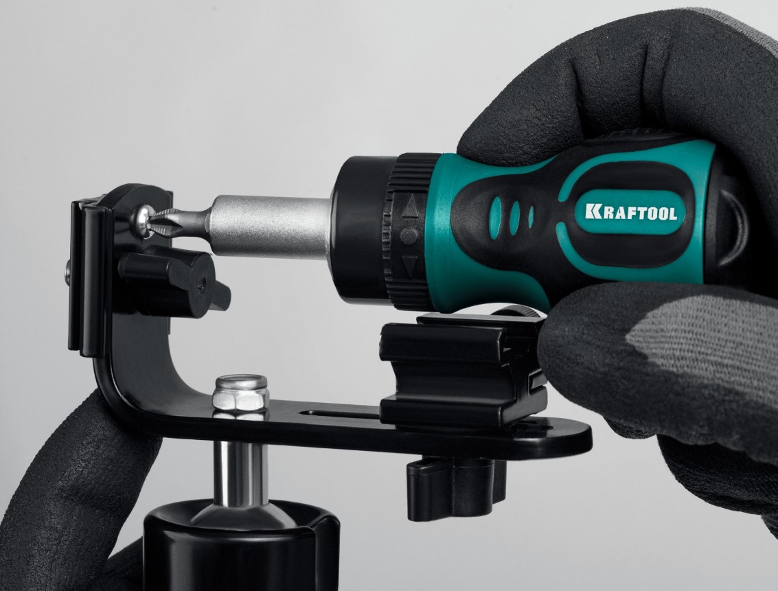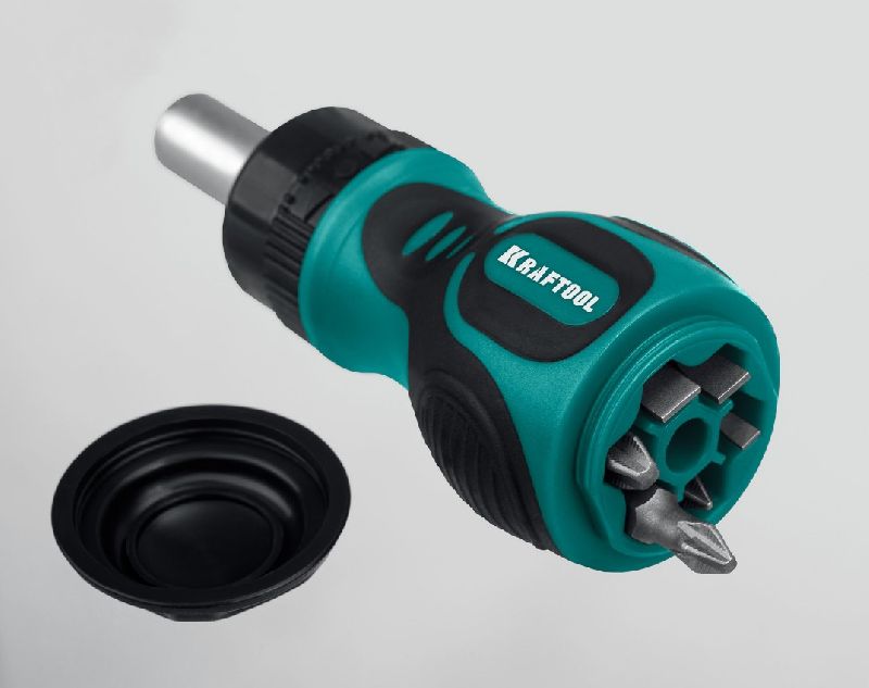 Компактная реверсивная отвертка KRAFTOOL c прочным трещоточным механизмом. Небольшой размер и хранение бит внутри рукоятки дают возможность всегда иметь отвертку под рукой