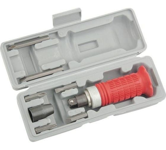 Отвертка имеет обрезиненную рукоятку с протектором, оснащена ударными битами SL – 7 x 35, 8 x 35, 8 x 65 мм