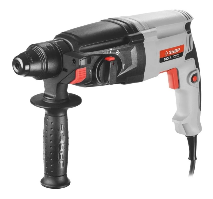 Перфоратор ЗУБР МАСТЕР П-26-800 предоставляет три режима работы: сверление, сверление с ударом и долбление. Дополнительно доступен режим поворота долота на заданный угол после каждого удара. Переключение между режимами осуществляется с помощью тумблера, расположенного сбоку на корпусе. Для обеспечения длительной работы предусмотрен фиксатор клавиши "Пуск", который освобождает руку пользователя от необходимости удерживать её нажатой.