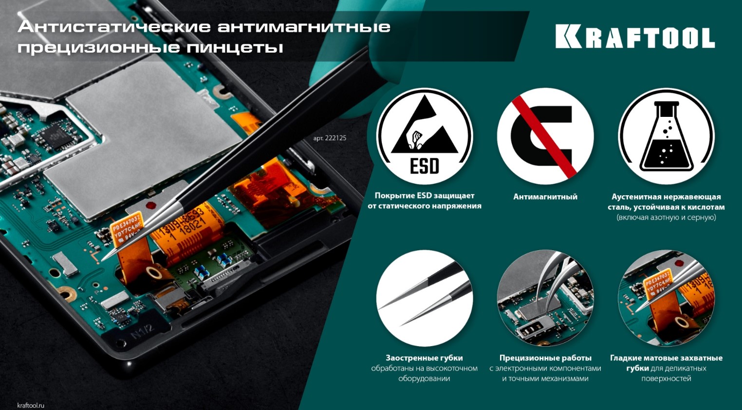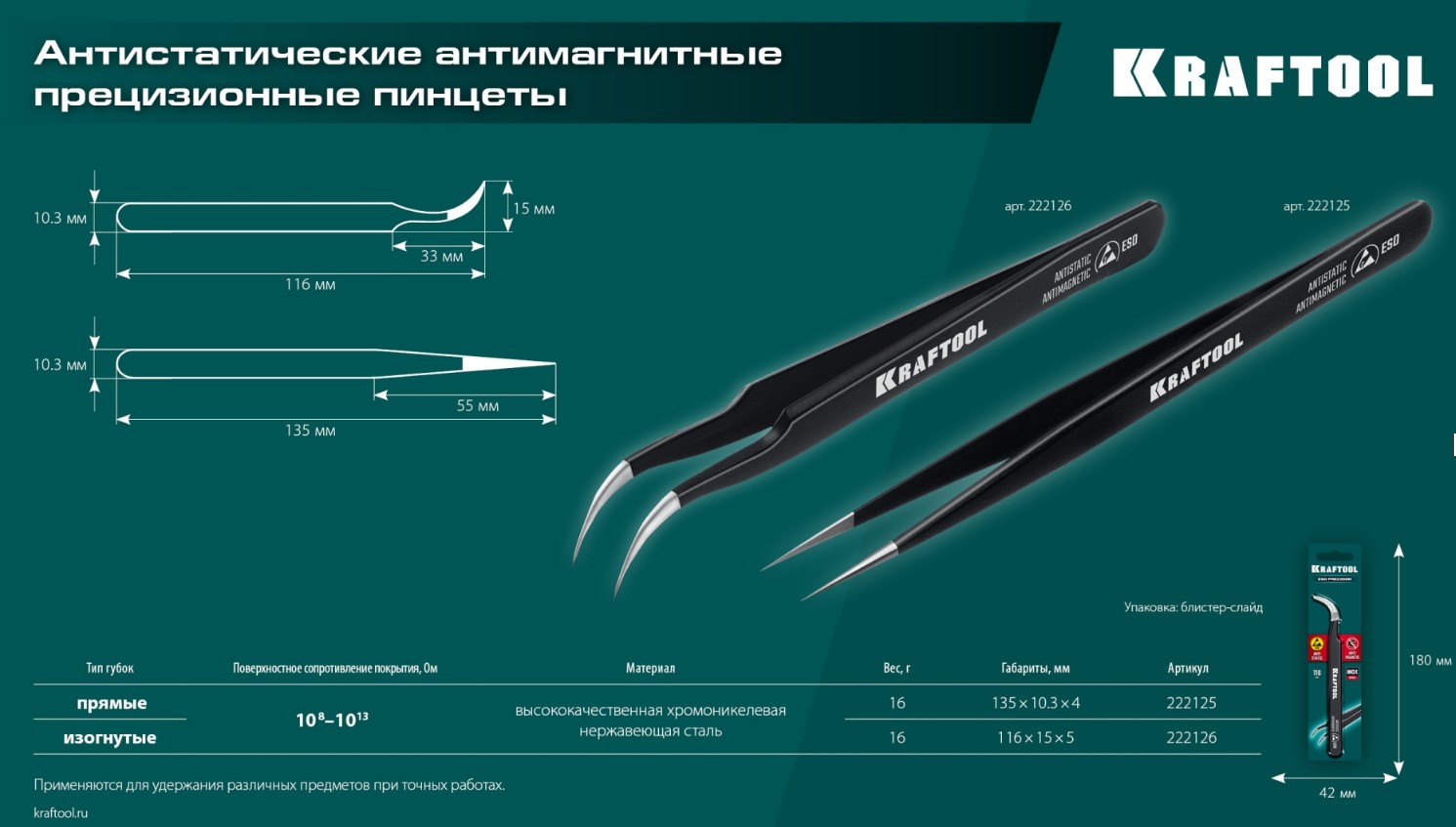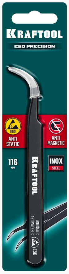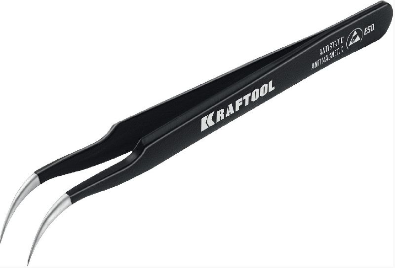 Прецизионный пинцет KRAFTOOL изготовлен из антимагнитной нержавеющей стали. Специальное покрытие ESD с поверхностным сопротивлением 10^8 Ω - 10^13 Ω защищает от электростатического разряда.