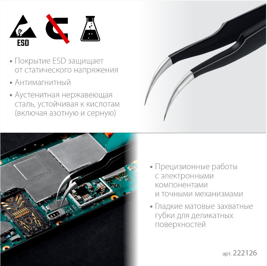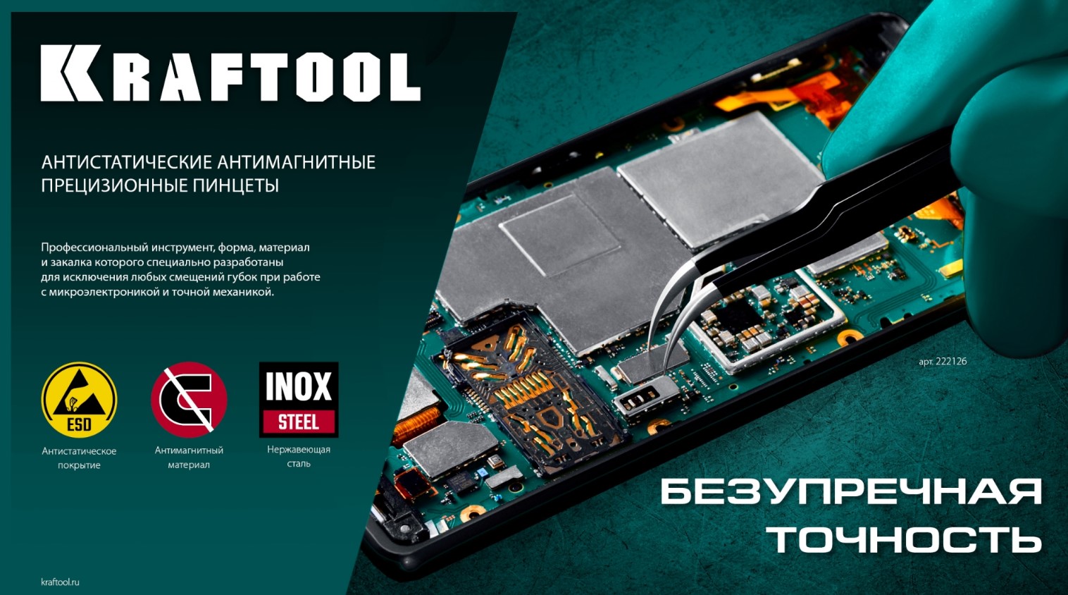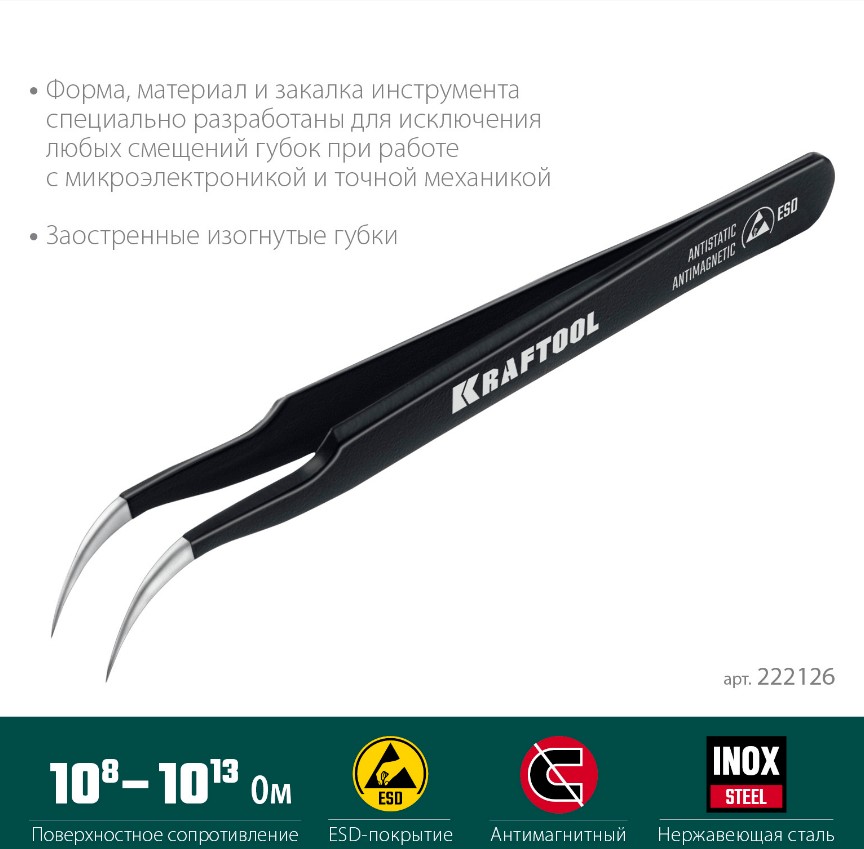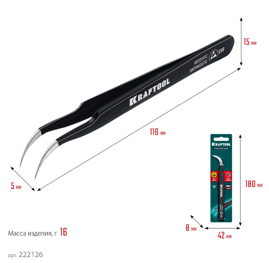 Прецизионный пинцет KRAFTOOL изготовлен из антимагнитной нержавеющей стали. Специальное покрытие ESD с поверхностным сопротивлением 10^8 Ω - 10^13 Ω защищает от электростатического разряда.