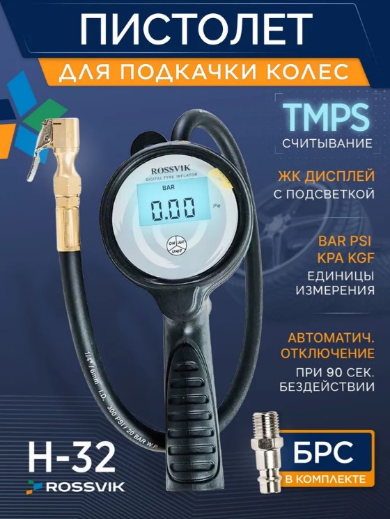 Пистолет для подкачки шин с электронным манометром Россвик H32 — это ваш идеальный помощник. Его легкая и ударопрочная конструкция делает его незаменимым в любом сервисе и СТО. Эта модель отличается простотой управления благодаря всего одной кнопке, и вас приятно удивит автоматическое отключение через 90 секунд, что экономит заряд батареи и увеличивает ее долговечность.