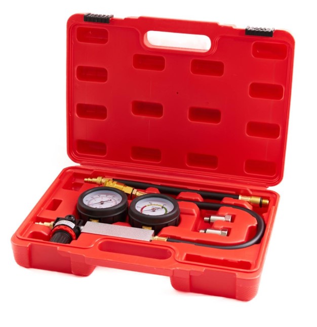 Инструмент используется для диагностики герметичности цилиндро-поршневой группы, позволяя оценить состояние поршневых колец, стенок цилиндра, клапанов и прокладки головки блока. Он измеряет процент утечки воздуха, подаваемого в цилиндр, что помогает выявить общий износ, плотность прилегания клапанов, целостность прокладки и клапана вентиляции. Подходит для большинства бензиновых двигателей и имеет адаптеры для подключения через свечу зажигания. Один манометр контролирует рабочее давление пневмосистемы, другой - утечку давления в двигателе.