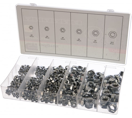 Набор гаек М3, М4, М5, М6, М8, М10, 600 предм Сибртех