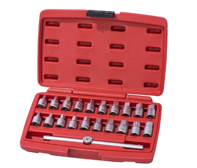 Набор головок для маслосливных пробок, 21 предметов изготовлены из прочной стали и устойчивы к внешним воздействиям. Используются при работах с автомобилем. Небольшие габариты позволяют использовать изделие в условиях ограниченного пространства.