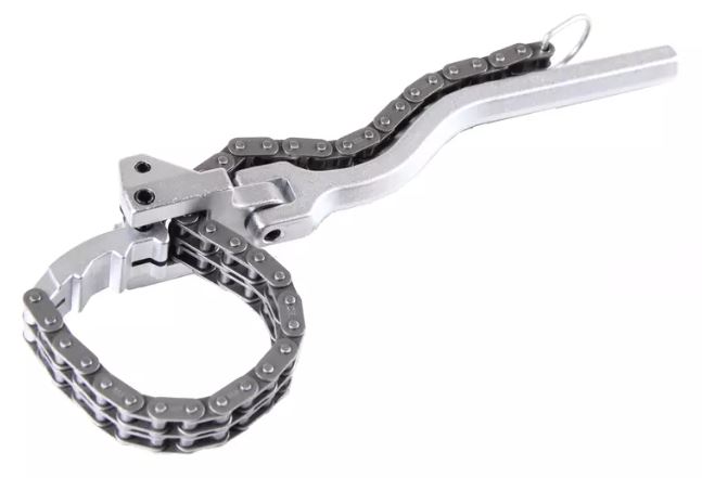 Съемник имеет диаметр захвата от 60 до 105 мм, что позволяет использовать его для различных типов фильтров. Регулируемая длина цепи обеспечивает надежный захват фильтра во время демонтажа, а шарнир позволяет работать в ограниченном пространстве.