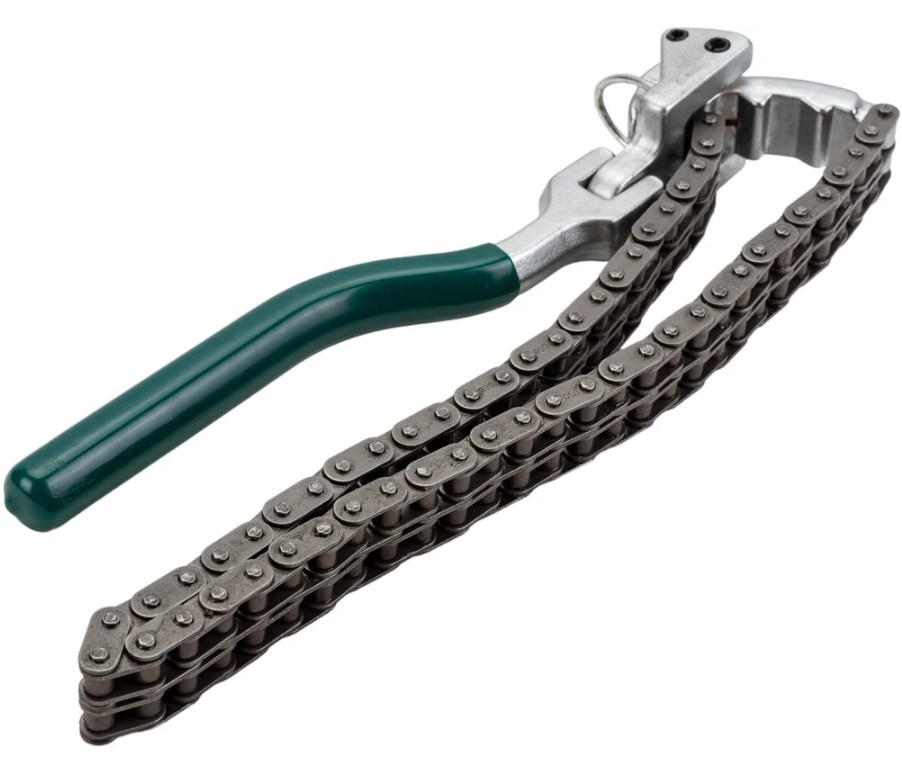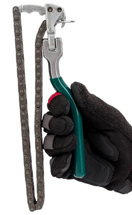 Усиленный ключ цепной для масляных фильтров предназначен для работы с фильтрами диаметром от 60 до 165 мм. Размер регулируется переустановкой цепи, которая имеет длину 520 мм и позволяет использовать инструмент в труднодоступных местах.