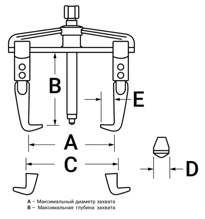 Съемник Licota ATB-1023D с двумя захватами "американского" типа предназначен для снятия подшипников, шкивов, зубчатых колес и других деталей с натягом. Внешний захват рассчитан на диаметр до 210 мм, внутренний — до 240 мм.