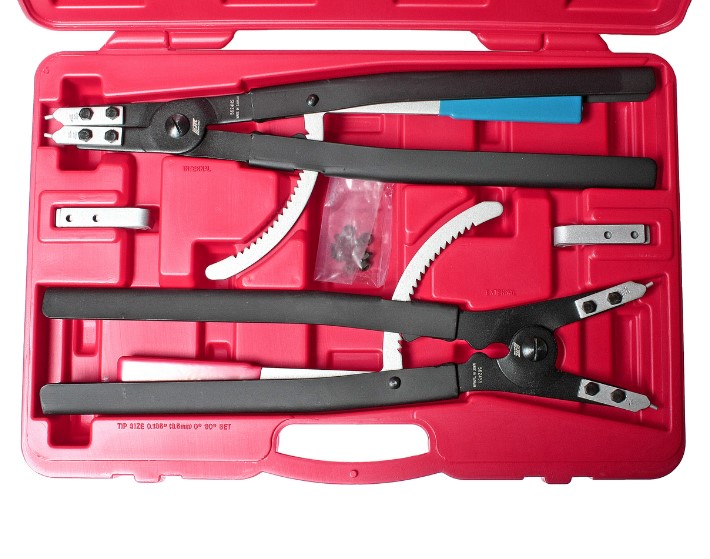 В набор входят сменные наконечники. Клещи с механизмом фиксации позволяют безопасно удерживать стопорные кольца, предохраняя их от повреждения.