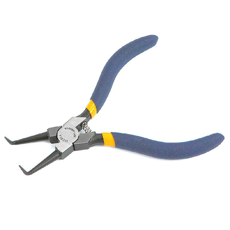 Съемник стопорных колец загнутый “японского типа”, из хром-ванадиевой стали с ручками из эргономичного нескользящего полимера. Съемник работает на сжим.
