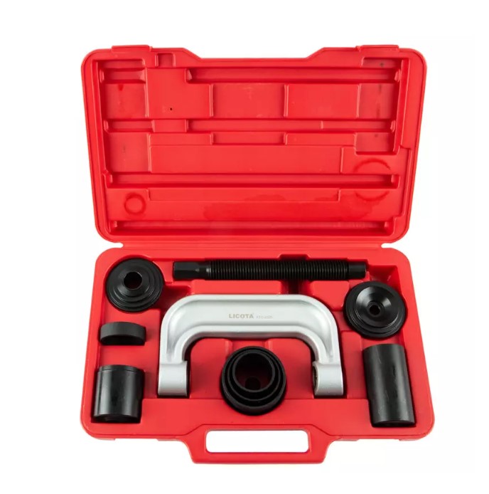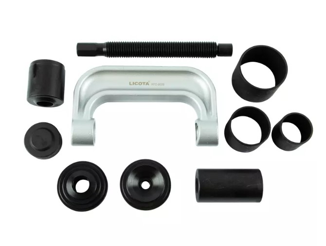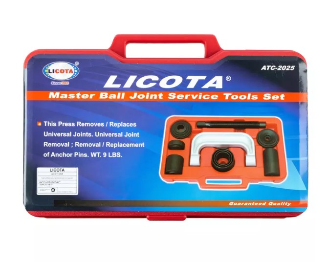 Набор для монтажа и демонтажа шаровых шарниров Licota ATC-2025 универсальный. Комплект из 9 предметов в пластиковом кейсе. Подходит для шаровых большинства легковых автомобилей, легкого коммерческого транспорта и полноприводных автомобилей.