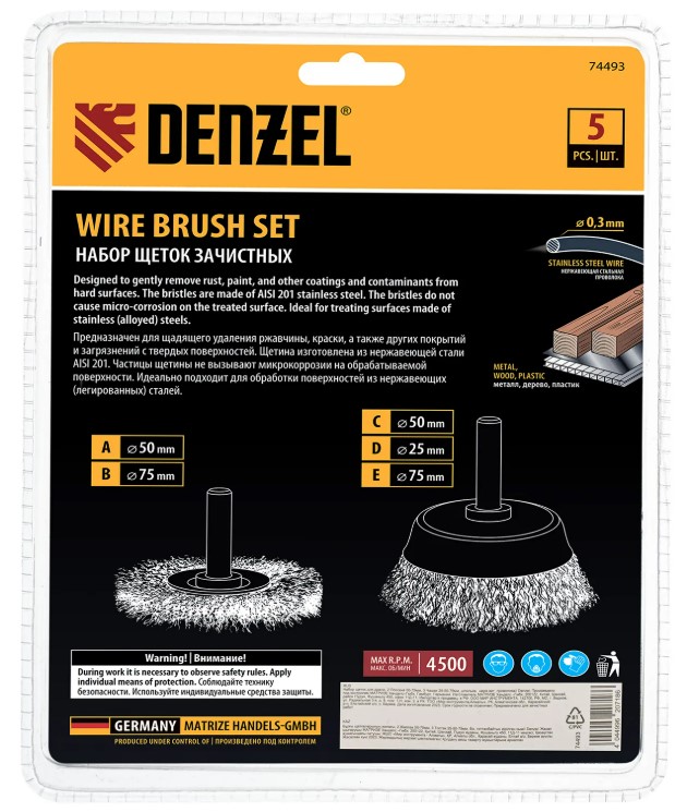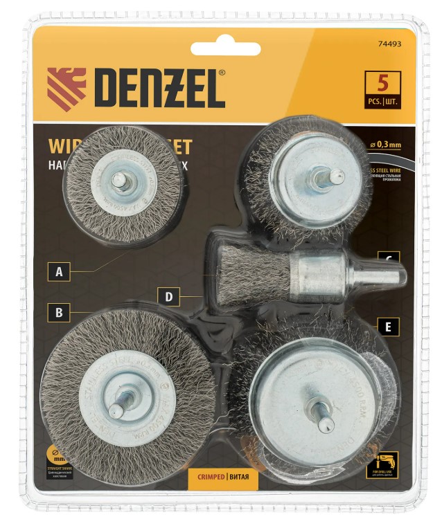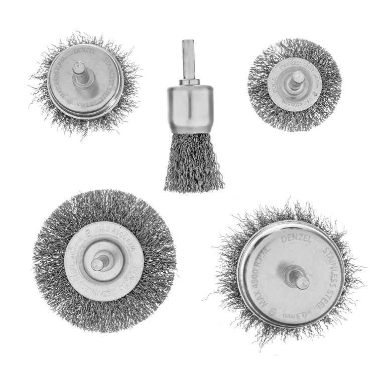 Набор щеток для дрели Denzel 74493 со шпилькой и щетиной из нержавеющей витой проволоки включает в себя 2 плоские насадки диаметром 50-75 мм и 3 «Чашки» диаметром 25-50-75 мм. Набор используется для щадящей обработки твердых поверхностей: металла, стали (в том числе нержавеющей), древесины, пластика, позволяет удалять старые лакокрасочные покрытия, ржавчину и загрязнения. Щетки в форме чашки оптимальны для обработки плоских поверхностей большой площади, плоская насадка удобна для зачистки пазов, изгибов и углов.