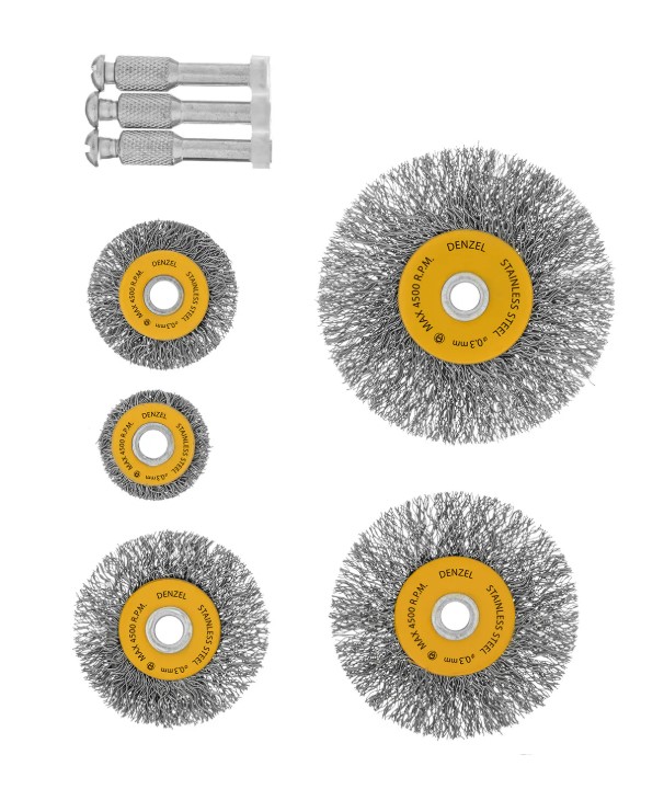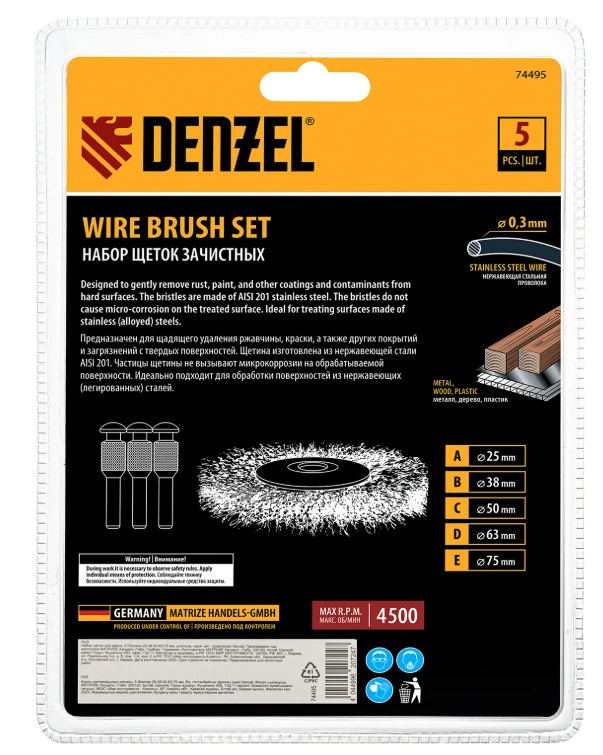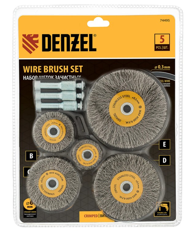 Набор щеток для дрели Denzel 74495 со шпилькой и щетиной из нержавеющей витой проволоки включает в себя 5 плоских щеток диаметром 25-38-50-63-75 мм. Набор используется для щадящей обработки твердых поверхностей: металла, стали (в том числе нержавеющей), древесины, пластика, позволяет удалять старые лакокрасочные покрытия, ржавчину и загрязнения. Плоская насадка удобна для зачистки пазов, изгибов и углов.