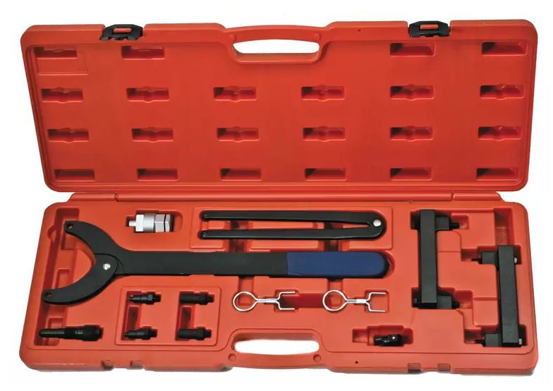 Набор фиксаторов для регулировки фаз ГРМ Licota ATA-2033A для автомобилей группы VAG с двигателями FSI объемом 3.2 л. Используются для фиксации газораспределительного механизма в заданном положении для точного выставления меток ГРМ. Подходит для цепных двигателей V6, V8, V10 (FSI, TFSI). Комплект из 9 предметов в пластиковом кейсе. Содержит приспособления для фиксации распределительных валов, коленчатого вала, инструмент для фиксации зубчатых колес, спецключи для проворота механизма ГРМ.