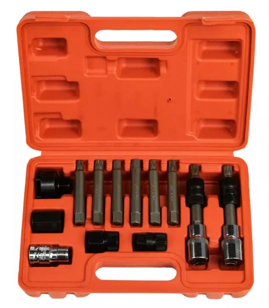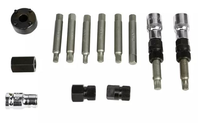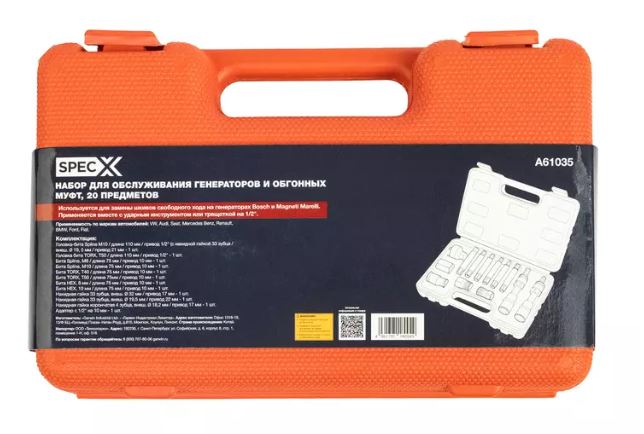 Набор для обслуживания генераторов и обгонных муфт SPECX A61035. Комплект из 13 предметов в пластиковом кейсе содержит головки и вставки для монтажа/демонтажа всех типов шкивов свободного хода Bosch и Denso. Марки автомобилей: VW, Audi, Seat, Mercedes, Renault, BMW, Ford, Fiat, Honda, Toyota, Porsche и т.д.