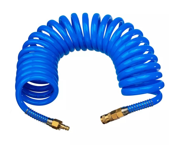Упругая спираль шланга не создает неудобств оператору пневмоинструмента, и после завершения работ принимает прежнюю форму.