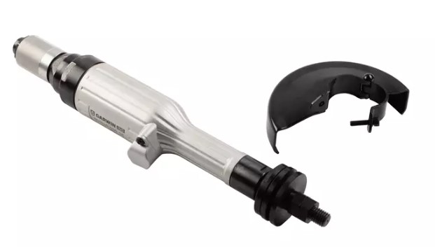 Инструмент весит 3,5 кг и имеет легкий корпус из алюминиевого сплава, удобный для работы одной рукой. Ротор и цилиндр пневмопривода из стали. Поворотное включение осуществляется через муфту с накаткой. Отвод отработанного воздуха предотвращает завихрение пыли.