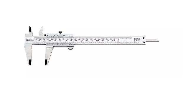 Штангенциркуль нониусный ASIMETO 0341-12-04 серии 341 из нержавеющей стали с губками для внутренних и наружных замеров и плоским глубиномером. Предназначен для измерения линейных размеров малогабаритных деталей.