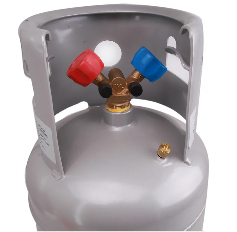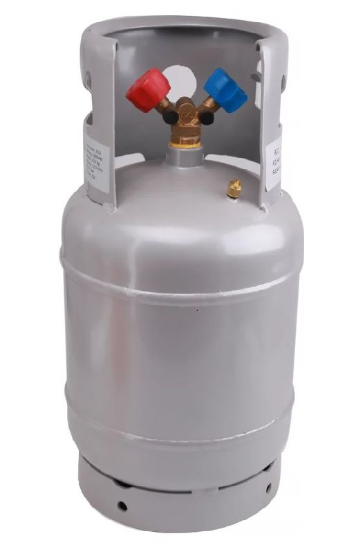 Двухвентильный баллон для сбора фреона, объемом 12,5 литра, предназначен для многоразового использования и может применяться для сбора различных типов фреона. Вес пустого баллона составляет 8,95 кг, а рабочее давление может достигать 35 бар. Баллон оснащен клапаном Шредера и двухвентильным коллектором, где синий кран предназначен для паровой фазы, а красный кран - для жидкой фазы.