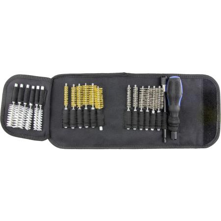 Набор применяется для чистки гнезд свечей зажигания, форсунок, каналов и цилиндров. Все щетки имеют привод 1/4" и совместимы с электрическим или пневмо инструментом. Включает 18 щеток (нейлон, нержавейка, латунь), рукоятки и удлинитель.