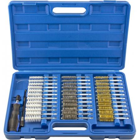 Щетки в наборе имеют привод 1/4 дюйма, что делает их совместимыми с электрическим и пневматическим инструментом. В комплект входят 36 щеток, рукоятка и удлинитель.