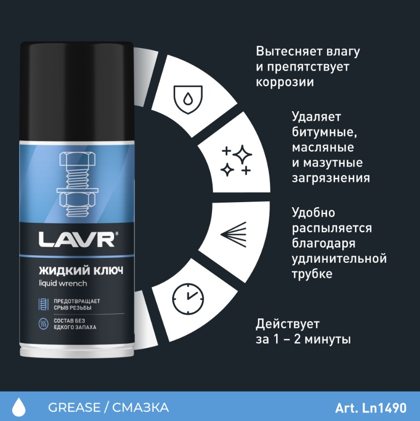 Специализированное средство для облегчения демонтажа прикипевших и приржавевших соединений и узлов. Обладает высокой проникающей способностью, за счет чего действует за 1 – 2 минуты.