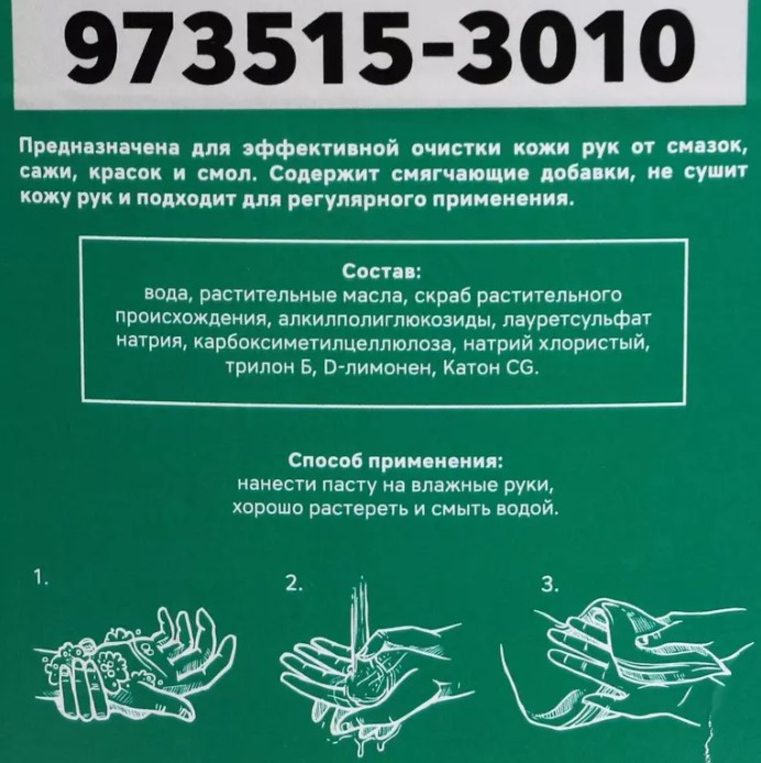 — очищает руки от промышленной грязи, сажи и металлической пыли.