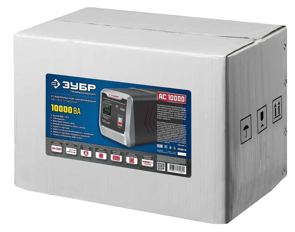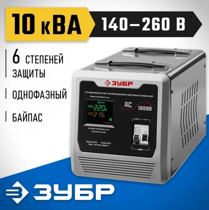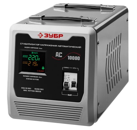 Автоматический стабилизатор с цифровой индикацией АСН-10000-1-Ц ПРОФ от бренда «Зубр» (артикул 59380-10) предназначен для защиты торгового и промышленного оборудования, систем освещения, водоснабжения и различных бытовых приборов от скачков напряжения и перегрузок в сети.