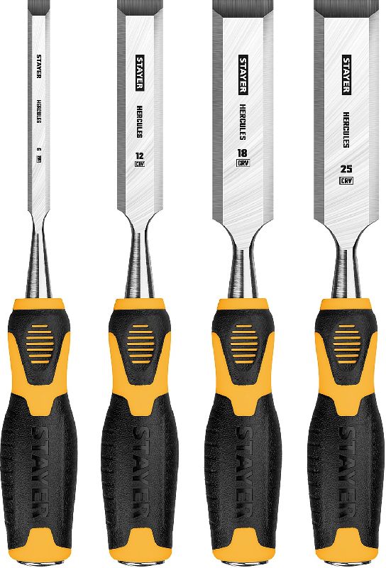 Набор стамесок-долот STAYER Hercules 4 шт. 18205-H4 включает профессиональные инструменты из хромованадиевой стали, обеспечивающие высокую прочность и долговечность. Лезвия закалены до твердости 60-65 HRC, что гарантирует длительную эксплуатацию.