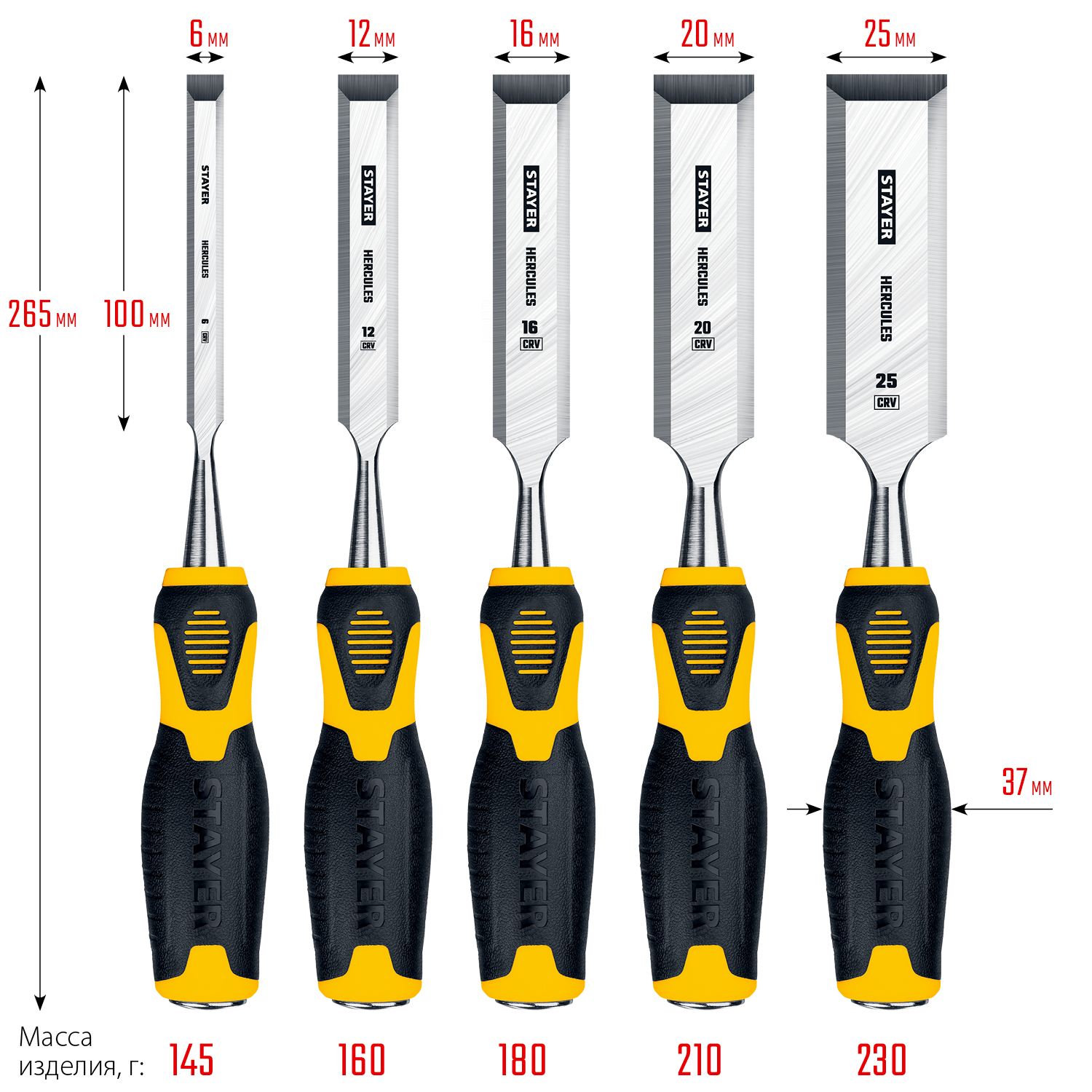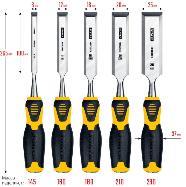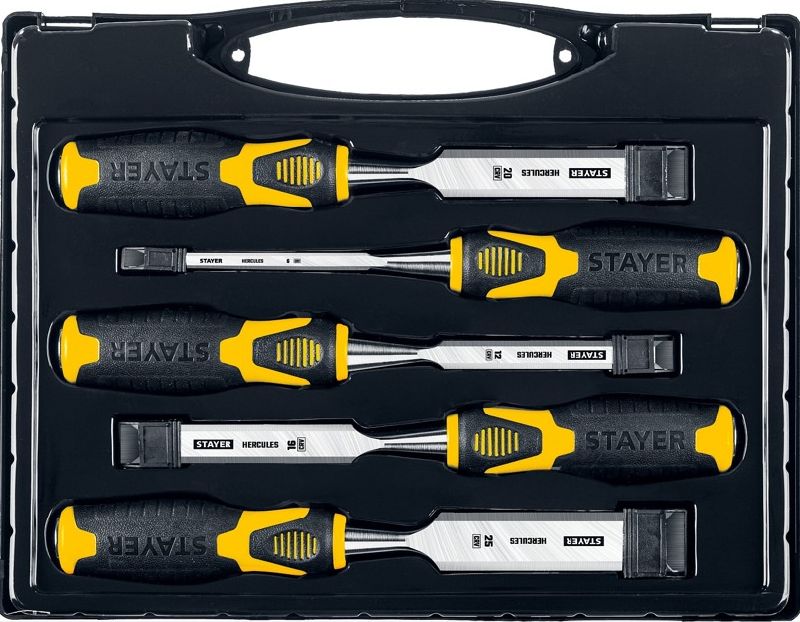 Набор стамесок-долот Stayer HERCULES 18205-H5_z01, состоящий из пяти штук, выполнен из упрочненной стали, что значительно увеличивает срок службы инструмента. Скошенное жало каждой стамески облегчает работу в узких и труднодоступных местах, обеспечивая точность и удобство при выполнении различных задач.