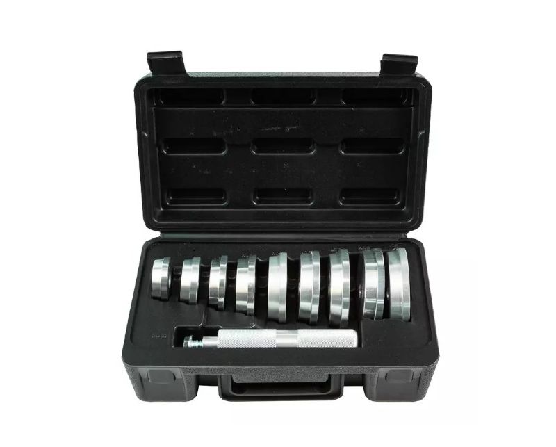 Набор оправок для запрессовки сальников, подшипников и сайлентблоков SPECX A01628. Девять оправок диаметром от 39,75 до 80,8 мм и съемная рукоятка.