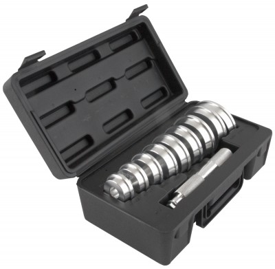 Набор конических оправок с буртом предназначен для качественной установки внешних обойм подшипников и уплотнений в агрегатах автомобильной техники. Инструменты из алюминиевого сплава предотвращают повреждения деталей при установке.