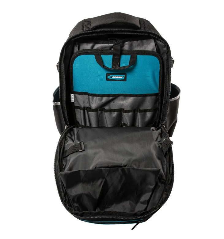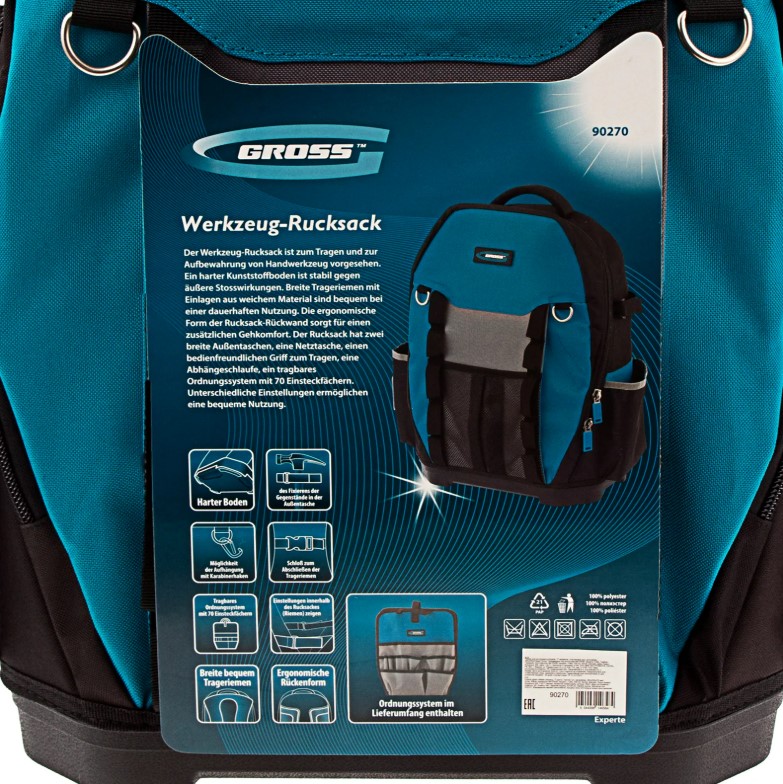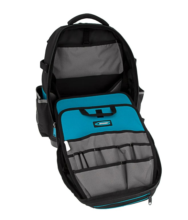 Рюкзак для инструмента Gross Experte 90270 габаритами 360 х 205 х 470 мм, с пластиковым дном и органайзером, имеет 77 карманов различной формы и размера, что позволяет максимально эффективно использовать его пространство. Предназначен для транспортировки и хранения мелкого и крупного инструмента. Органайзер с 70 карманами можно использовать отдельно, а для удобного размещения на рабочем месте предусмотрена специальная петля.