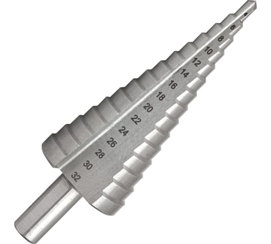 Сверло ступенчатое 4-32 мм, 15 ступеней Волжский Инструмент 5016006 предназначено для получения отверстий различного диаметра без перестановки режущего инструмента. На каждой ступени есть маркировка фактического диаметра.