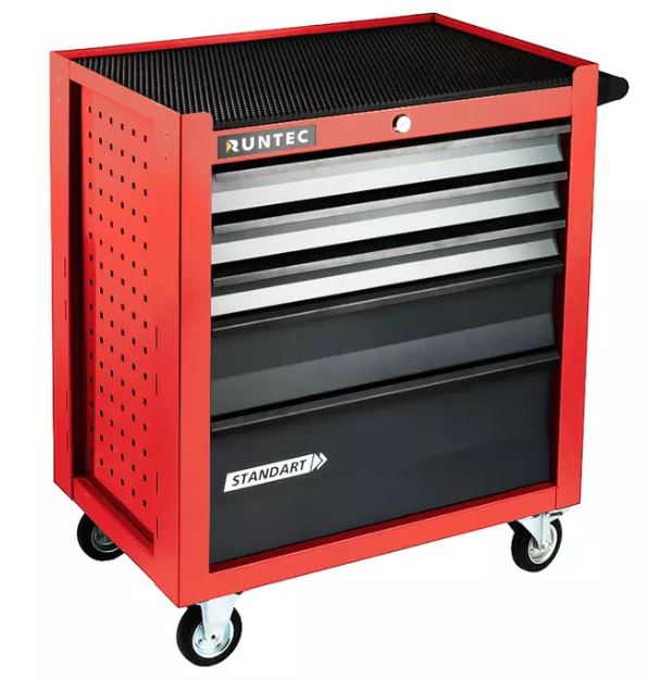 Инструментальная тележка RUNTEC RTSTD-5G с 5 ящиками создана для хранения инструментов на производстве, складе, в гараже или автомастерской. Все ящики можно разом запирать на центральный замок, чтобы предотвратить несанкционированный доступ.