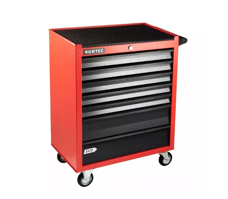Тележка для инструмента RUNTEC RTEC-7R серая имеет безрамную конструкцию и легче рамных аналогов. Она защищена от коррозии и механических повреждений порошковым покрытием, а ручки оборудованы долговечным слоем «soft-touch». Центральный замок обеспечивает защиту от несанкционированного доступа.