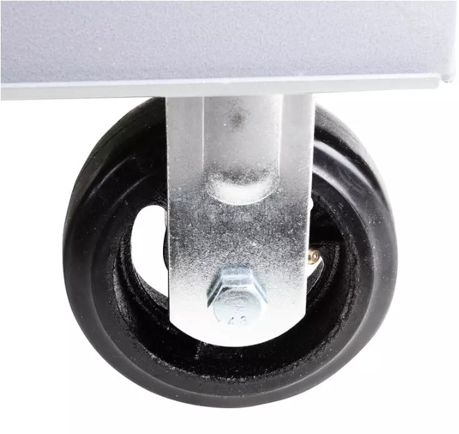 Эта тумба на колесах изготовлена из цельного металлического листа толщиной 1,2 мм и окрашена порошковым покрытием серого цвета, что защищает ее от механических повреждений и коррозии.