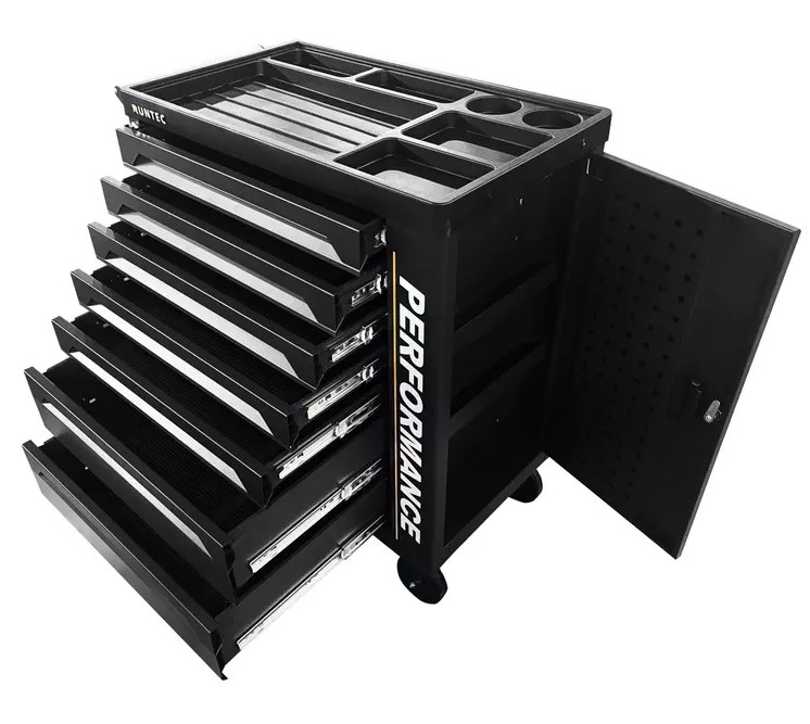 Инструментальная тележка RUNTEC для мастерских, автосервисов и производства. Оснащена 7 ящиками с системой push-to-open. Боковая секция с тремя полками и замком. Алюминиевая рукоять с анатомической формой и нескользящим покрытием. Верхняя часть — столешница из ABS-пластика с лотками для мелкого инструмента. Корпус из холоднокатанной стали. Перфорированные боковые стенки для крючков и аксессуаров. Увеличенные колёса из износостойкого полипропилена.