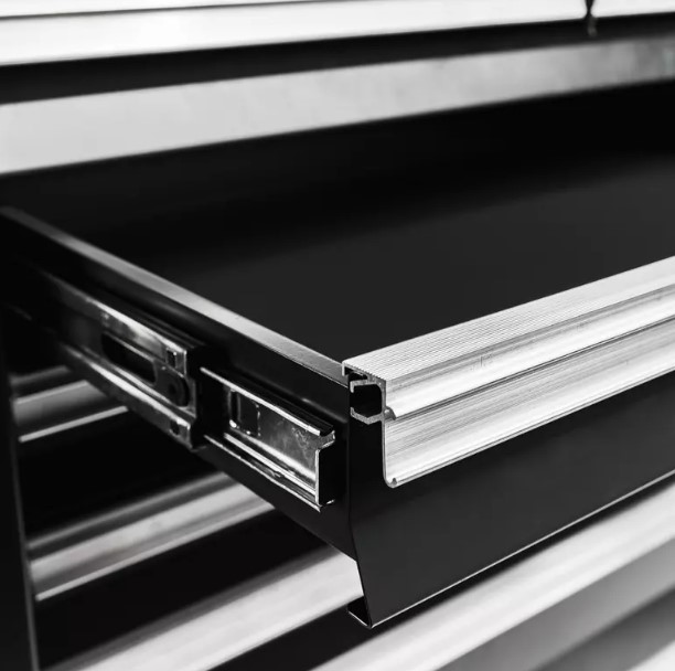 Телескопические направляющие с доводчиками, текстурные ручки ящиков, центральный замок.