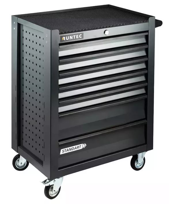 Инструментальная тележка RUNTEC RTSTD-7G с 7 ящиками создана для хранения инструментов на производстве, складе, в гараже или автомастерской. Конструкция состоит из толстых листов стали, соединенных со сварной рамой. На саму тележку можно установить перфорированную панель. Все ящики можно разом запирать на центральный замок, чтобы предотвратить несанкционированный доступ.