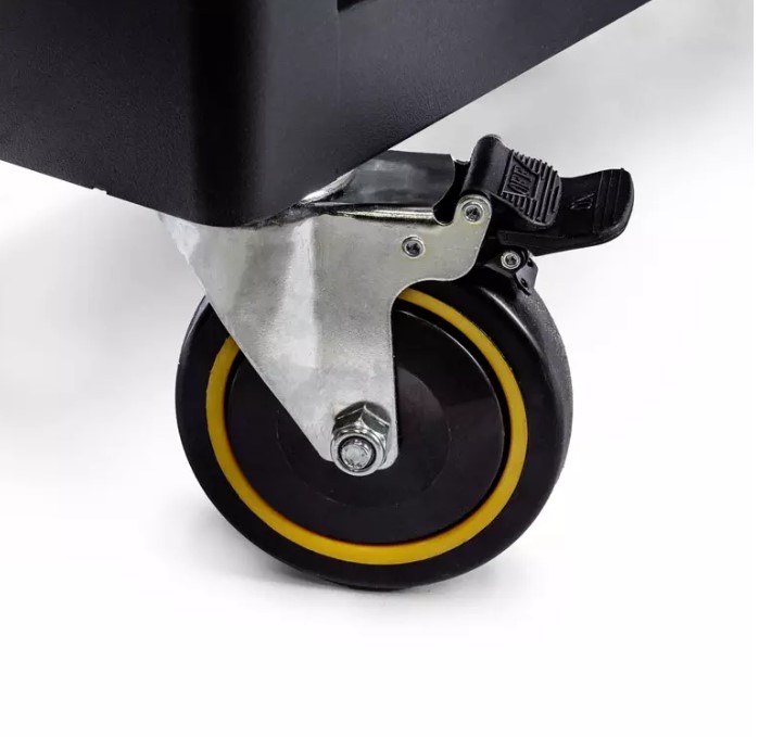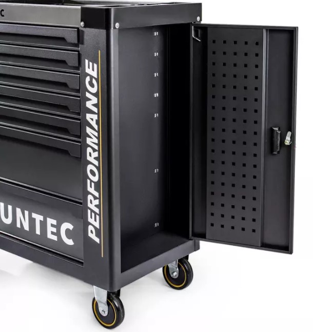 Ящики оснащены системой push-to-open, благодаря чему они не откроются при передвижении тележки. Внутри каждого ящика — мягкий резиновый коврик. Боковой отсек имеет отдельный замок, на дверце расположена перфорированная панель для крючков.