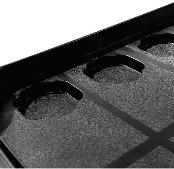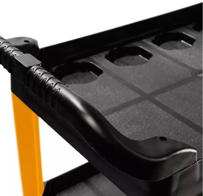 Легкая конструкция из полипропилена усилена ребрами жесткости. Тележка не подвержена коррозии и механическим повреждениям. Ее маневренность и устойчивость обеспечиваются поворотными резиновыми колесами. Две анатомические рукоятки облегчают транспортировку. В тележке предусмотрено 12 углублений для хранения мелких деталей и расходников. Максимальная нагрузка составляет 200 кг.