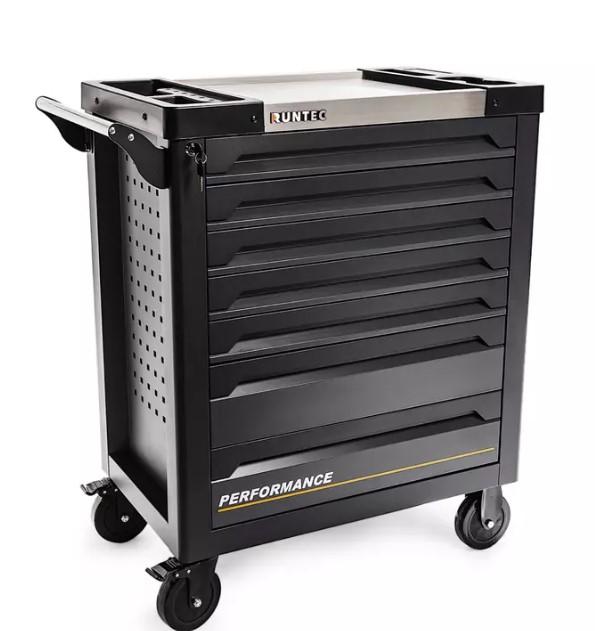 Столешница тележки изготовлена из износостойкой нержавеющей стали, по бокам от нее расположены пластиковые отделения для инструмента или оснастки.