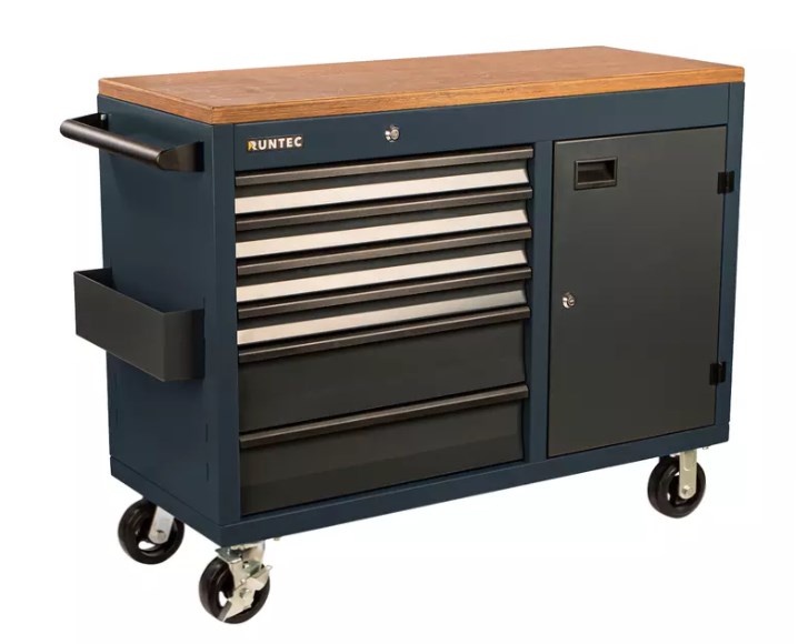 Тележка-верстак помогает эффективно организовать рабочее место, позволяя работать с деталями без необходимости перемещения к стационарному верстаку. Она покрыта стойкой матовой цинконаполненной краской, защищающей от коррозии и повреждений. Колеса с полиуретановыми втулками не требуют смазки. Устройство имеет 6 выдвижных ящиков с полным выдвижением и доводчиками, которые можно закрывать одним ключом благодаря центральному замку. Сбоку расположен карман для баллонов, а магнит на двери предотвращает случайное открытие. Внутри есть отсек для документов.