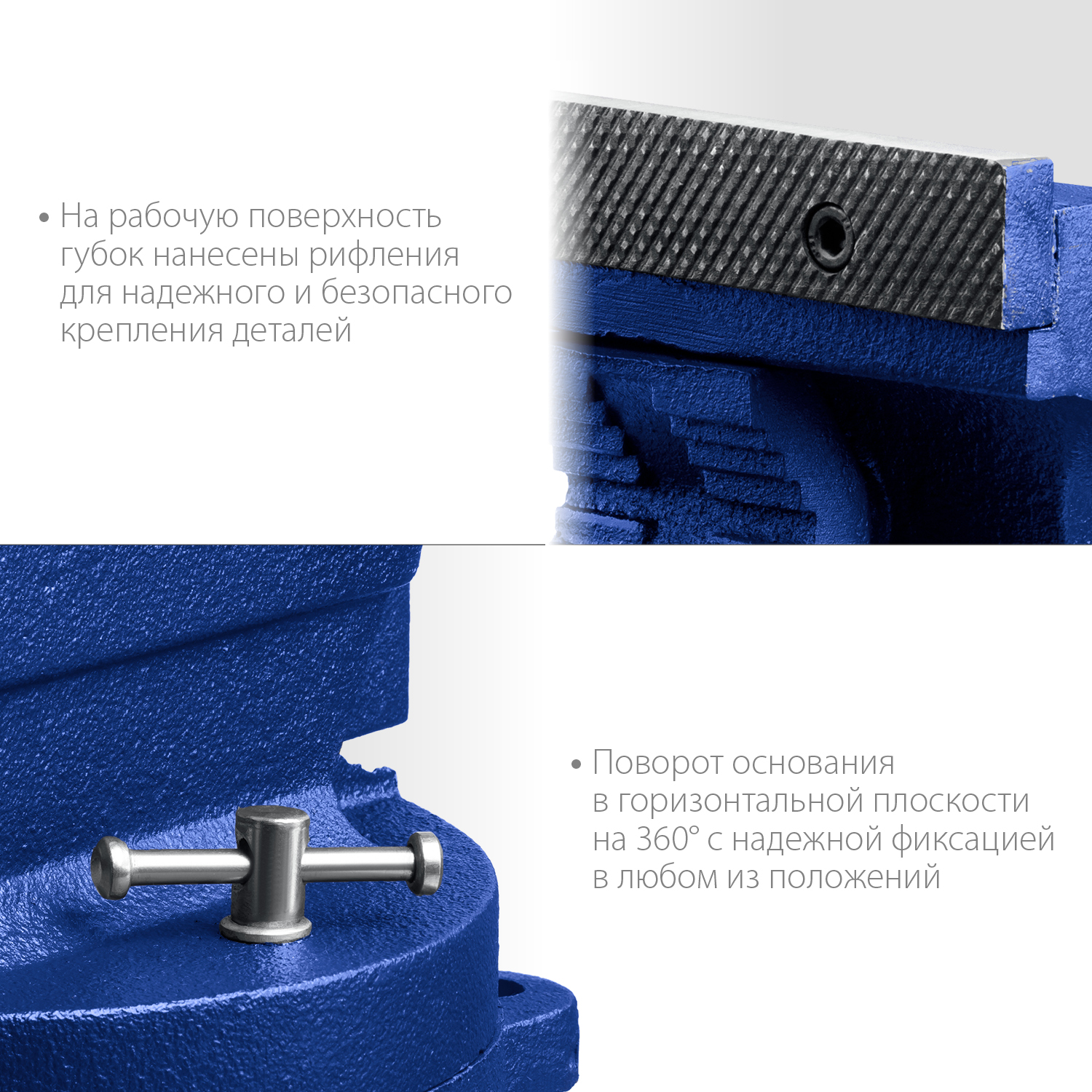 - Поворотное основание позволяет перемещать корпус тисков в горизонтальной плоскости на угол от 0 до 360 градусов
