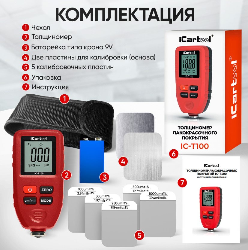 Толщиномер лакокрасочных покрытий iCartool IC-T100 предназначен для измерения толщины краски, эмали, шпаклевки, оцинковки и покрытий из хрома и анодированных материалов на различных металлических поверхностях, включая черные и цветные металлы. Благодаря комбинированному принципу работы устройство автоматически определяет тип металла под лакокрасочным слоем. Высокая точность измерений обеспечивается за счет индивидуальной калибровки сенсора для каждого типа металла. В комплект поставки входит набор для самостоятельной калибровки и защитный футляр для хранения и транспортировки.
