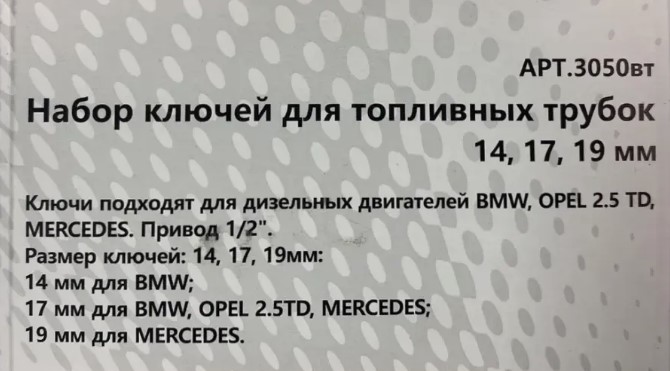 Ключи подходят для дизельных двигателей BMW. OPEL 2.5 TD, MERCEDES привод ½». Размер ключей: 14,17,19мм: 14 мм для BMW; 17мм для BMW, OPEL2.5TD, MERCEDES; 19 мм для MERCEDES.