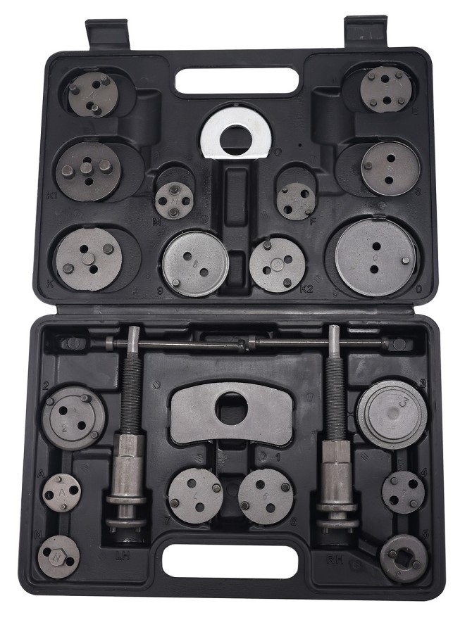 Используется для вдавливания поршней тормозных цилиндров дисковых тормозов с правой и левой резьбой. Благодаря наличию различных насадок подходит для большинства автомобилей.