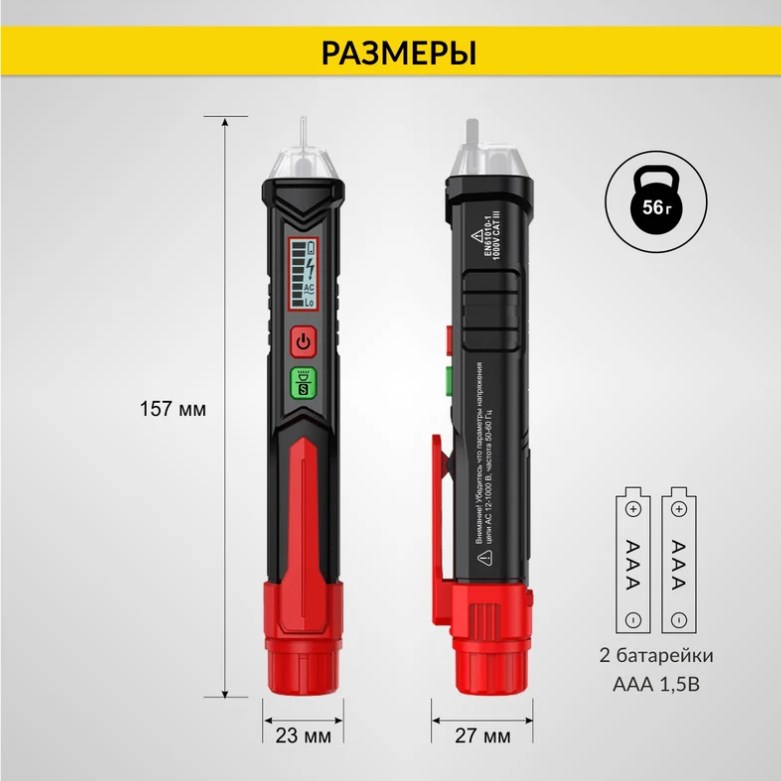 Бесконтактный тестер для обнаружения напряжения переменного тока с регулируемой чувствительностью. Тестер выполнен в компактном корпусе в виде ручки, что обеспечивает удобство при использовании. Максимальный предел чувствительности составляет 1000 В. В темных помещениях тестер оснащен светодиодной подсветкой, что облегчает работу в таких условиях.