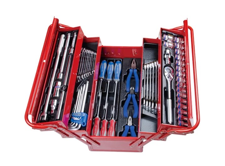 Универсальный набор инструментов 62 предмета KING TONY 902-062MR поставляется в эргономичном раскладном ящике, оснащенном транспортировочной рукояткой с широкой поверхностью хвата. В его конструкции предусмотрено 5 отделений для ложементов с инструментами. Пользователь может расположить необходимые ему для работы приспособления по уровням (всего 3), в зависимости от частоты и надобности применения.